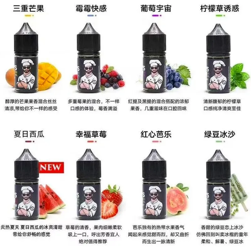 荔枝西瓜, 芒果鳳梨, 黑莓檸檬, 冰咖啡, 葡萄蘋果, 焦糖椰子, 奶油爆花米, 草莓聖代, 烤山核桃, 檸檬塔, 藍莓蛋糕, 肉桂麵包, 草莓餅乾, 酒香椰子, 蘋果派, 煙草, 紅心芭樂, 檸檬草, 葡萄, 零度可樂, 藍莓果, 綠豆沙, 水蜜桃, 西瓜, 草莓, 芒果